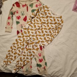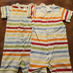 Ett set med babykläder. Inkluderar två sparkdräkter med knappar framtill, en randig och en med mönster. Det finns även en grå body med tryck och ett par matchande byxor, samt ett set med Superman-tryck bestående av en tröja och byxor.