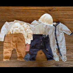 Ett set med tre pyjamasar. En randig från Polarn O. Pyret i blått och vitt, en med bilar från Polarn O. Pyret och en vit med djur från Newbie. Alla med lång ärm och ben. Stl. 62-68.
