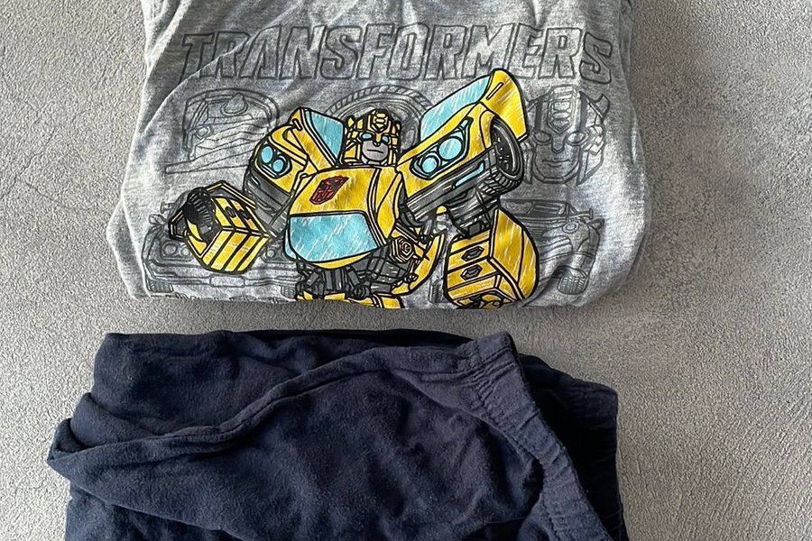 Ett set med en grå tröja med Transformers tryck och ett par mörkblå byxor.