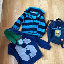 Ett klädpaket med tre pyjamasar. Ett set är mörkblått med vita stjärnor, ett set är grått med Marvel motiv och ett set är grått med bilar på tröjan och mörkblå byxor.
