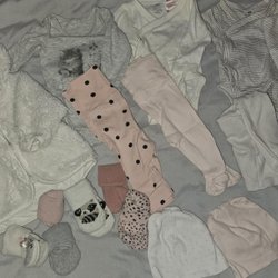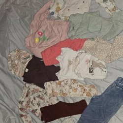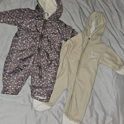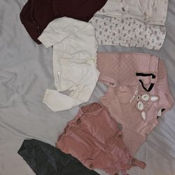 Tre pyamaser. En vit med körsbärsmönster, en rosa med ett björnansikte och en beige med svarta prickar.