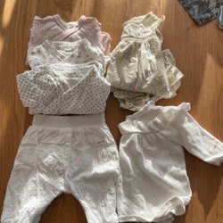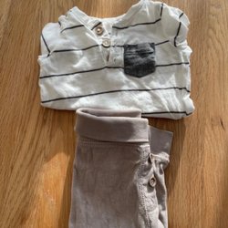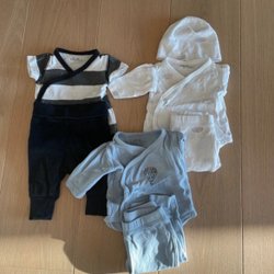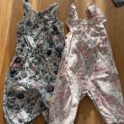 Två pyjamasar med dragkedja. Den ena är randig i svart och vitt, och den andra är randig i blått, grått och vitt.