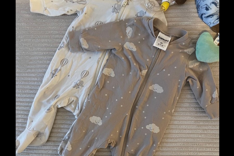 Två fina pyjamasar med dragkedja. En grå med moln och stjärnor och en vit med elefanter och luftballonger.