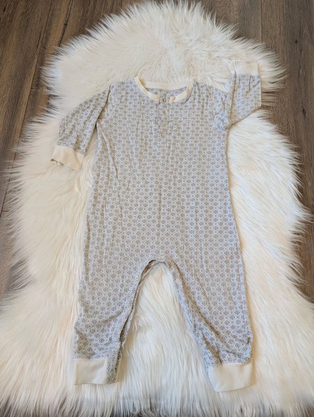 Fin babypyjamas i ljusbått med ett tryckt mönster över hela plagget. Den har långa ärmar och ben, samt en knappslå framtill.