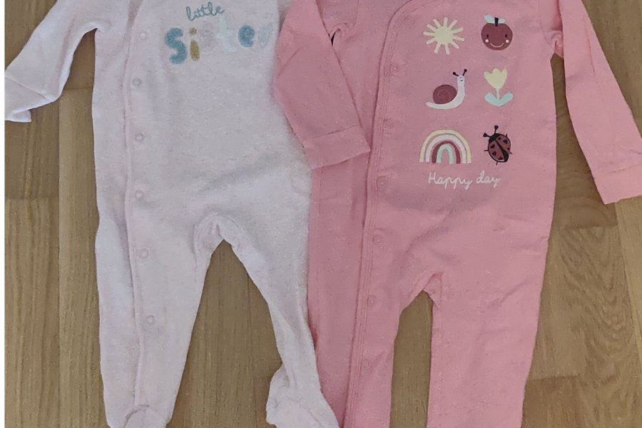 Två söta baby pyjamasar i rosa toner. Den ena är ljusrosa med texten ”little sister” och den andra är rosa med tryck av sol, äpple, snigel, blomma, regnbåge och nyckelpiga samt texten ”Happy day”.