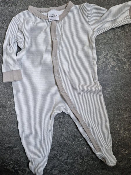 En söt, randig pyjamas med långa ärmar och fötter. Den har en grå (lite åt det bruna hållet)kant runt halsen och längs knapparna framtill. Pyjamasen knäpps med tryckknappar. Är väldig mysig. Inga fläckar eller hål vad jag sett