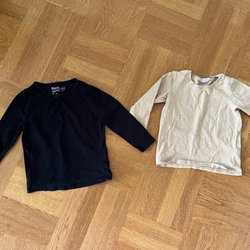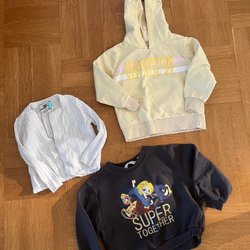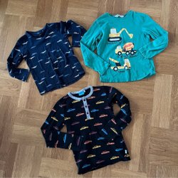 Två Syskonmatchande tröjor i storlek 92 och 122/128. Ytludd, samt lite sprucket tryck på storlek 92, och ett streck (mest troligt från bläckpenna) på ena ärmen och på ryggen på storlek 122/128, men annars i fint använt skick.