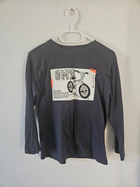 Grå långärmad tröja med ett tryck av en BMX-cykel och texten "BMX Extreme Sports World Championship North Houston Bike Park Extreme Sports Complex".
