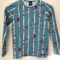 Blå långärmad tröja från Polarn O. Pyret med ett tryck av en björn kung på framsidan. Tröjan har randiga ärmar i olika nyanser av blått och grått. Fint skick. Stl 86.