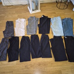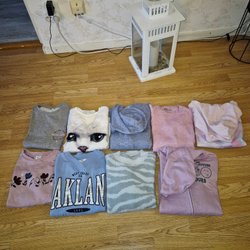 Har flera tröjor i stickat material, sweatshirt 146/152 i en annan annons och leggings/jeans/byxor i storlek 146/152