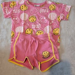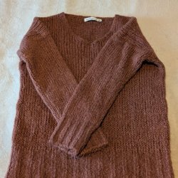 Ett set med tre långärmade tröjor. En är i gul färg, en i blå och en i rosa. Den rosa tröjan har några små fläckar.