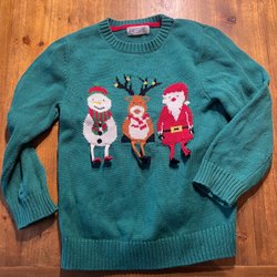 Grön tröja med jultema. Motiven inkluderar en tomte, en pingvin och en ren.