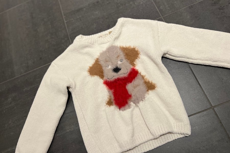 Vit stickad tröja med en söt hundapplikation framtill. Hunden har en röd halsduk runt halsen.
