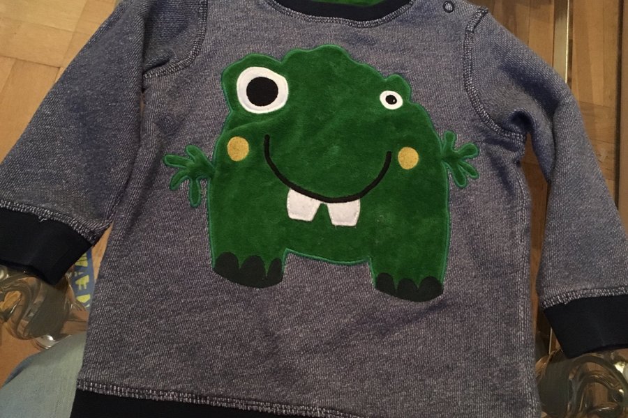 Fin tröja med ett coolt motiv och knäppen på axeln. Storlek 92 . Ny skick