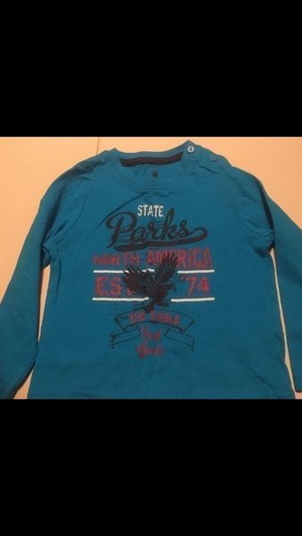 En mörk turkos tröja med text. Nyskick . Storlek 86/92. 2st knappar på vänster axel