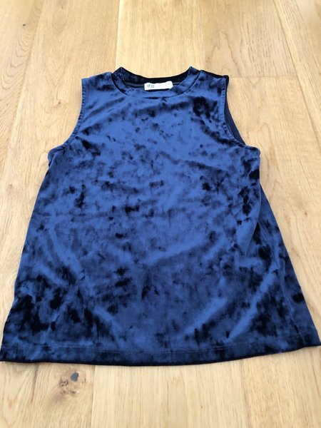 Ärmlös topp i en mörkare blå nyans. Toppen har en rund halsringning,st 134/140.