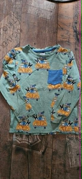 Grön långärmad tröja med ett mönster av gula bilar med figurer och bagage på taket. Tröjan har en liten bröstficka i avvikande färg.