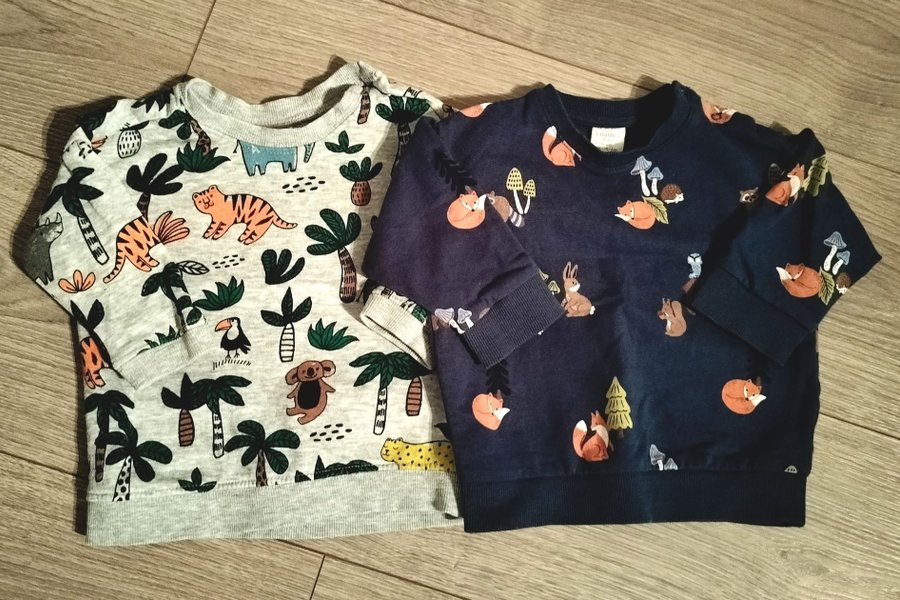Två tröjor med knappar vid halsen, i storlek 68. En grå med djungelmotiv och en mörkblå med skogsdjur. Båda i gott använt skick, kommer från djur- och rökfritt hem. Se gärna mina övriga auktioner, jag har mycket babykläder ute.