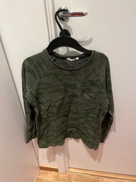 Grön långärmad tröja med kamouflagemönster och en bröstficka. Tröjan har en rund halsringning och raglanärmar.