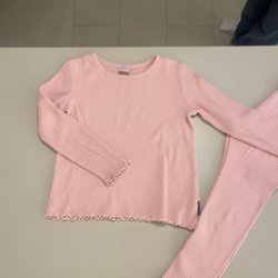 Fint set från Mini Rodini med tröja och byxor i gult med svarta prickar. Tröjan har korta ärmar och byxorna har resår i midjan. Sparsamt använt.