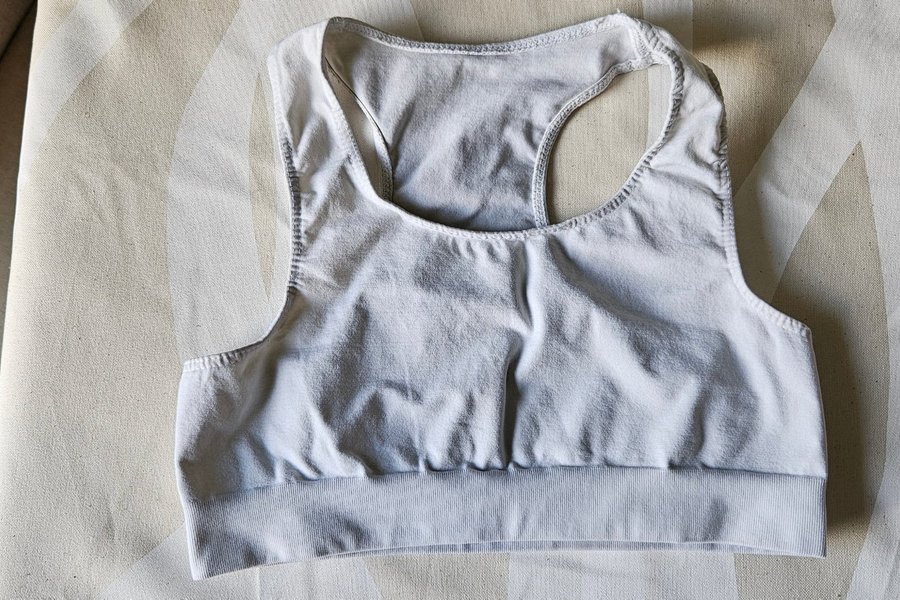 Vit topp med brottarrygg. Den har en bred resår under bysten.