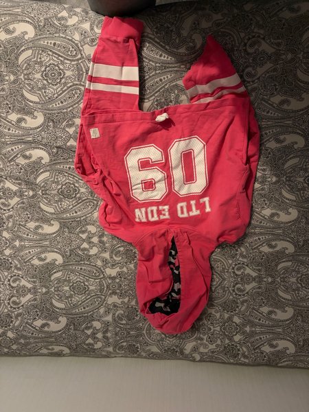 Rosa huvtröja med vita ränder på ärmarna och siffran ”60” samt texten ”LTD EDN” tryckt på framsidan. Huvtröjan har en huva med ett mönstrat foder i svart och vitt.