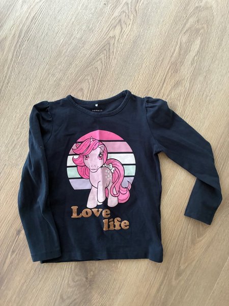 Langærmet sort bluse med et tryk af en lyserød pony og teksten ”Love life” i guldglimmer.