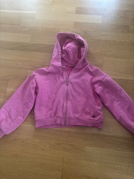 En rosa huvtröja med dragkedja framtill. Tröjan har en huva och ribbade muddar vid ärmslut och nederkant. Den är en praktisk och bekväm tröja som passar bra för vardagsbruk.