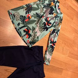 Blus/topp med ett livfullt mönster i svart, vitt, orange och gult. Toppen har en lös passform med vida ärmar och en rundad halsringning. En knappdetalj finns vid nacken som är lite uttöjd men stör inte funktionen i övrigt fint skick. Stl 128