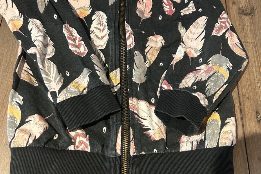 Svart med ett mönster av fjädrar i olika färger som rosa, grått och gult. Jackan har en dragkedja framtill och ribbade muddar i ärmslut och nederkant. Fint skick Stl.98/104
