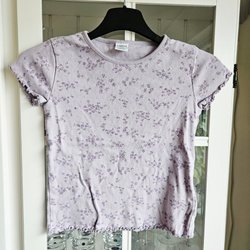 Lila topp med volangkanter längs ärmarna. Toppen har en rund halsringning och en ribbad textur. En liten gul fläck finns på framsidan.