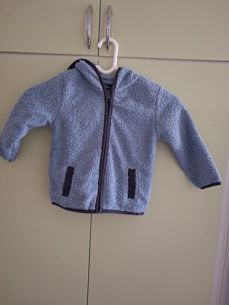 En mysig ljusblå tröja med huva och dragkedja. Jackan har två fickor framtill och mörkare blå detaljer runt dragkedjan, fickorna och muddarna.