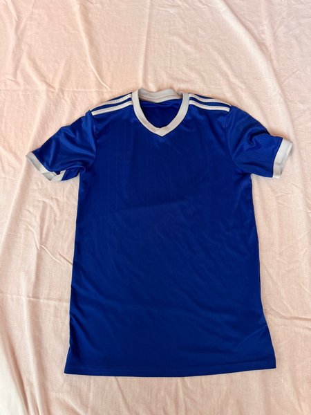 sporttröja med vita detaljer på krage, ärmslut och axlar. Tröjan har en V-ringning och tre vita ränder på varje axel.