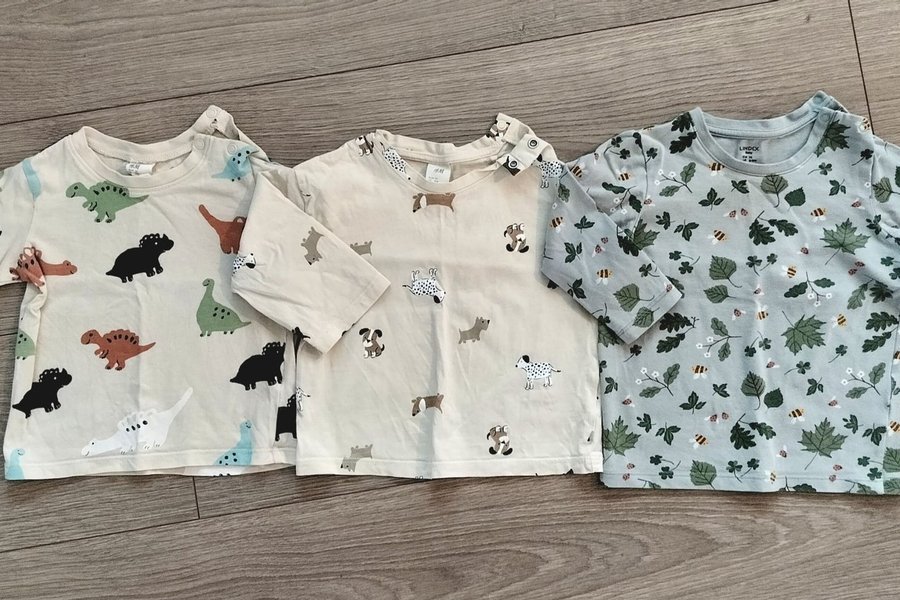 Tre långärmade tröjor med knäppning vid halsen i storlek 74. Alla i gott använt skick. Kommer från djur- och rökfritt hem. Vi tvättar parfymfritt.