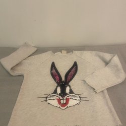 Grå tröja med dragkedja och en stor tecknad illustration av en flicka med rosett i håret, samt några rosa och svarta glittriga paljetter. 2 fickor på sidan. Fint skick