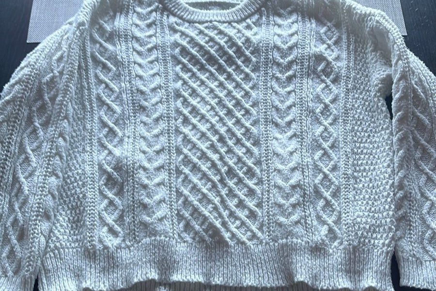Tröja med intrikata flätmönster över hela plagget, vilket ger en texturerad och detaljerad look. Halsen är rund och ribbad, liksom muddarna i ärmslut och nederkant. Flätorna varierar i storlek och riktning, med både vertikala och diagonala mönster som skapar ett dynamiskt uttryck. En klassisk design som passar för många tillfällen.