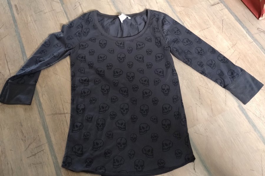 Grå långärmad tröja med ett tryck av döskallar över hela tröjan. Den har en rund halsringning och muddar vid ärmsluten.