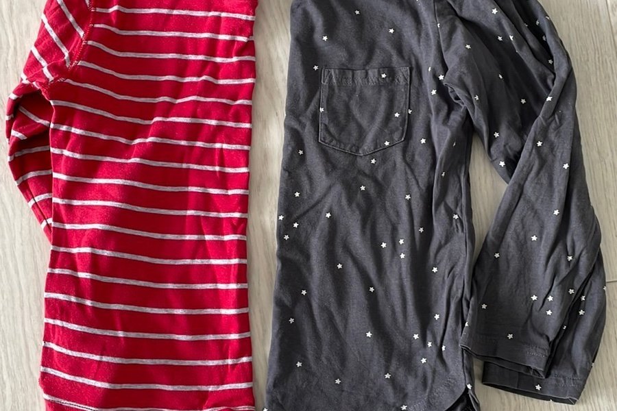 Två långärmade tröjor för barn. Den ena tröjan är röd med vita ränder. Den andra tröjan är mörkgrå med vita stjärnor och har en bröstficka.