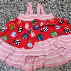 En söt rosa klänning med små svarta mönster. Klänning har långa ärmar och en rund halsringning.