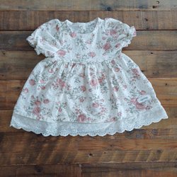 En söt, vit klänning med ett blommigt rosmönster. Klänningen har små volangärmar.