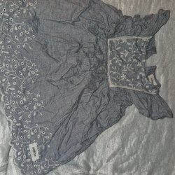 Söt, svart/mörkgrå klänning med en vacker vit spetskrage. Klänningen har tre knappar framtill och trekvartsärmar.