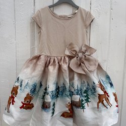 Klänning med ett unikt mönster av hjortar, träd och blommor i en vacker färgkombination. Klänningen har långa ärmar och en bekväm passform.