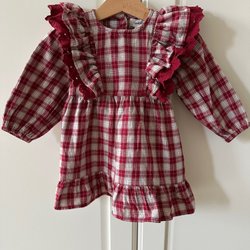 Röd och vit rutig klänning med lång ärm och volangdetaljer. Klänningen har en resår i midjan.