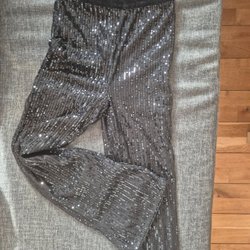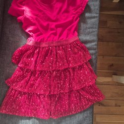 klänning med paljetter i regnbågens alla färger och ett rosa band i midjan. Klänningen har ett rosa foder och stängs med dragkedja i ryggen.
