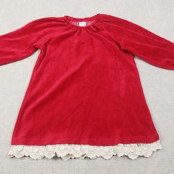 Säljer en långärmad klänning som är röd färgen och har vinter motiv.
