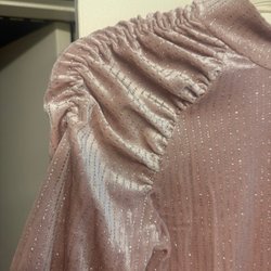 Svart klänning med långa ärmar och hög krage. Klänningen har ett mönster av tunna, vertikala ränder i en ljusare färg. Puffärmar.