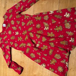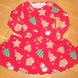 Klänning i röd färg med vit krage och svart rosetttryck framtill. Klänningen har långa ärmar och ett löst, A-linjeformat snitt.