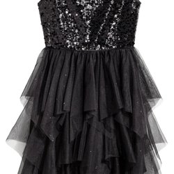 Svart glittrig klänning med en axel och volangdetaljer. Klänningen har lång ärm på ena sidan och en smal axelband på den andra.