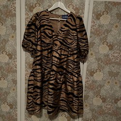 Mönstrad klänning med trekvartsärm. Klänningen har en ledig passform och knäpps med knappar i nacken. Mörkblå botten med svart mönster (se närbilder för bäst beskrivning av färg). I jättefint skick!!