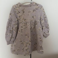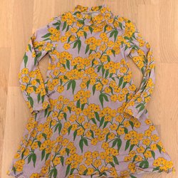 Söt klänning/tunnika med huva och blommigt mönster. Klänningen har korta ärmar och en volang nedtill med spetskant. Fint skick förutom ett pyttelitet hål som jag sytt. Syns knappt då det är nertill.